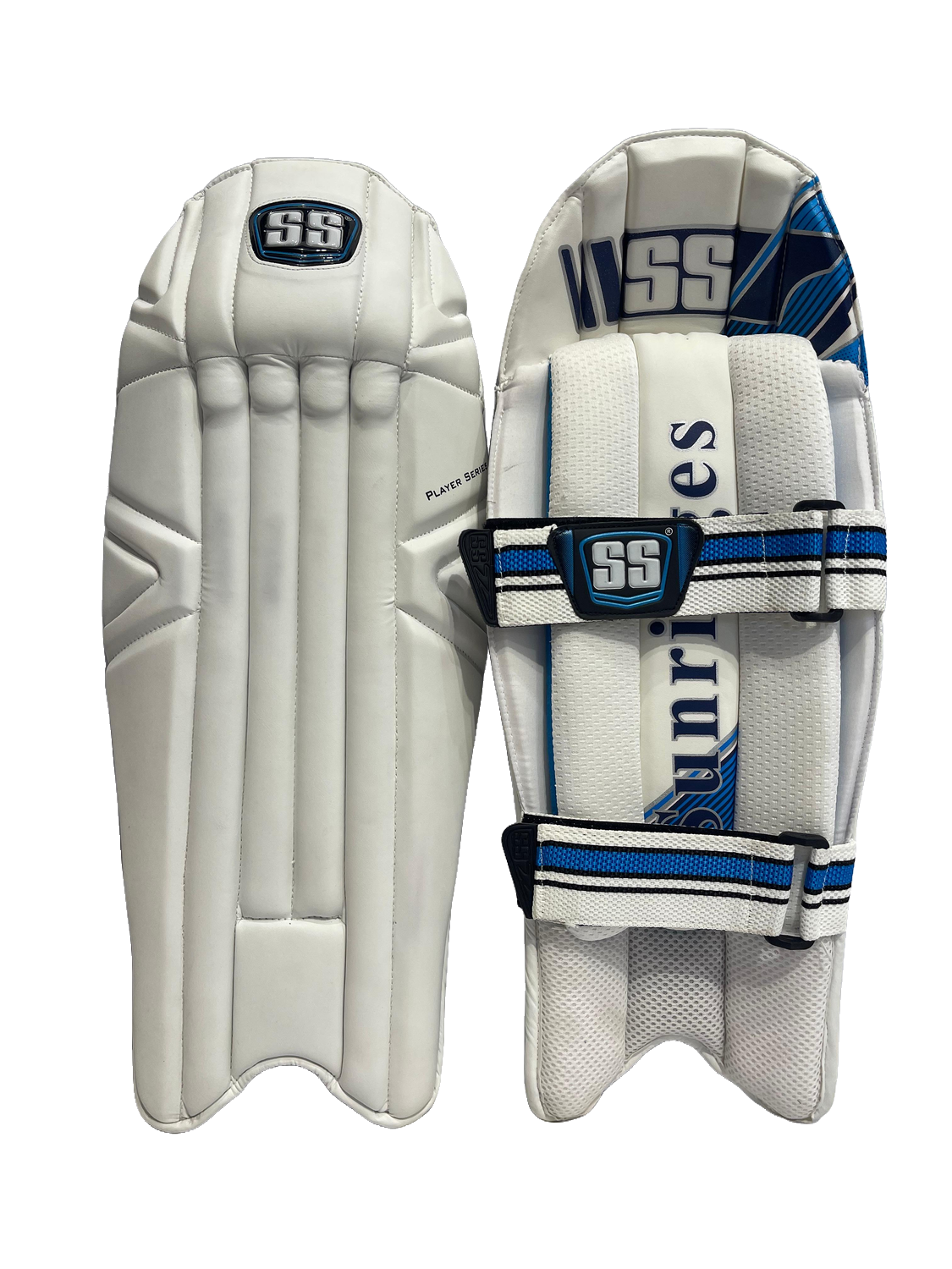 The SS Player Series Wicket Keeping Legguard Pads are traditional-style, lightweight pads for club-level play, featuring a durable Korean PU front and a high-density foam core for good shock absorption and a lighter feel. Key features include a classic seven-bar vertical bolster pattern for protection, a streamlined profile for better knee flexibility, an ergonomic design for comfort during long sessions, and wide Velcro straps for a secure fit. These pads are easy to clean, offer value for money, and provide essential safety without the advanced features or premium cost of higher-end models, making them ideal for developing players or those on a budget.